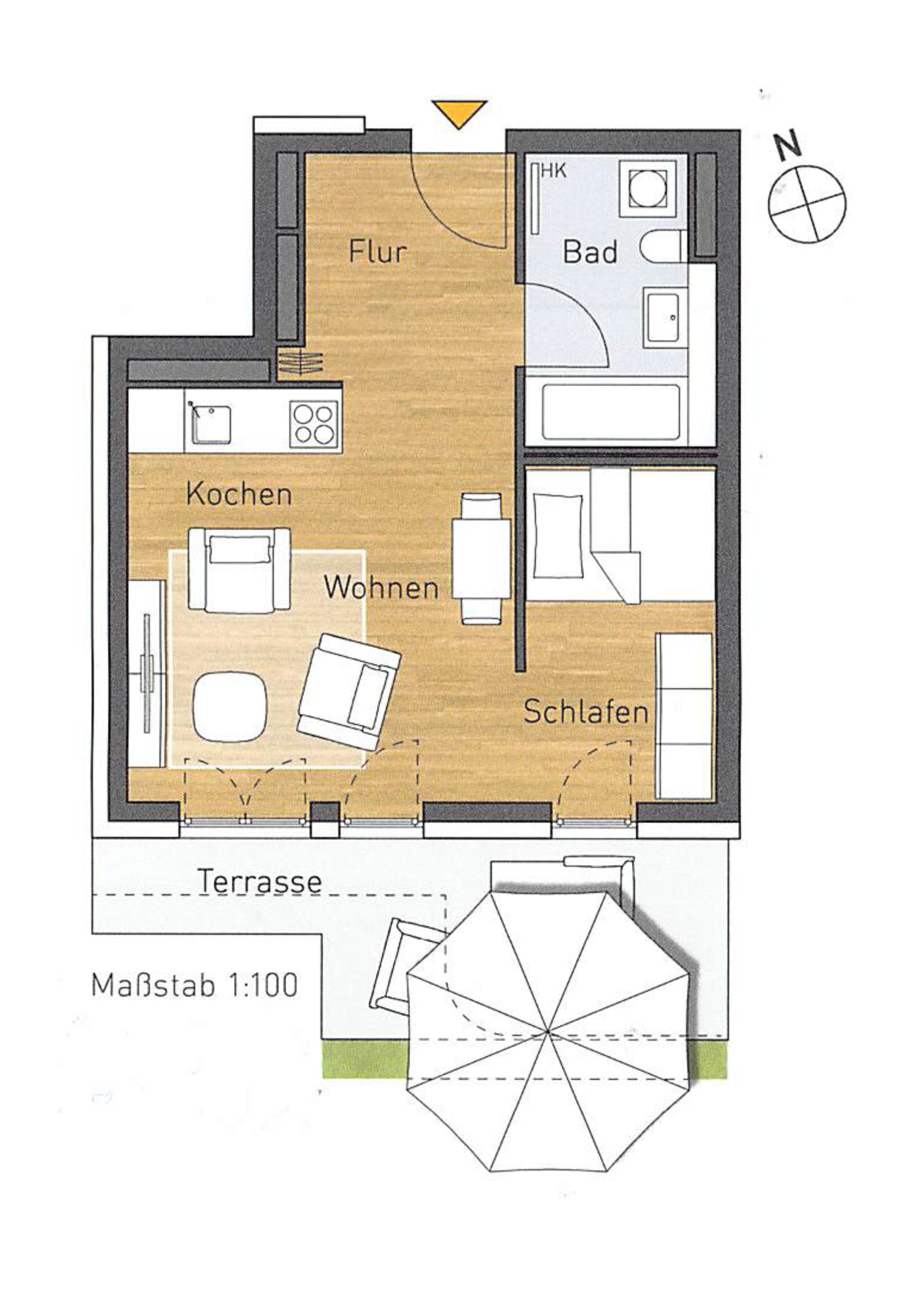 Zum Appartement gehört eine 11,5 qm groĂźe Terrasse zur privaten Nutzung. In der gesamten Wohnanlage stehen ca. 2 570 Quadratmeter allgemein verfĂĽgbare Wege-, GrĂĽn- und Freiflächen zur VerfĂĽgung.Â